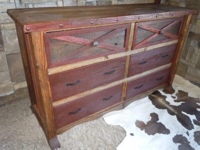 The Barn Door Barnwood Rustic collection features beautiful weathered Reclaimed Barnwood construction along with old-school barn door crosses for added character. Built locally, these are some of the most durable pieces of furniture in the industry. This collection is available in many different accents (Red, Green, or Blue Accents) and several different finishes and customizable dimensions for every piece! Posts are solid 3 1/2" x 3 1/2" studs that provide the most solid frame in the industry. Allow approx. 4-6 weeks to build and ship.