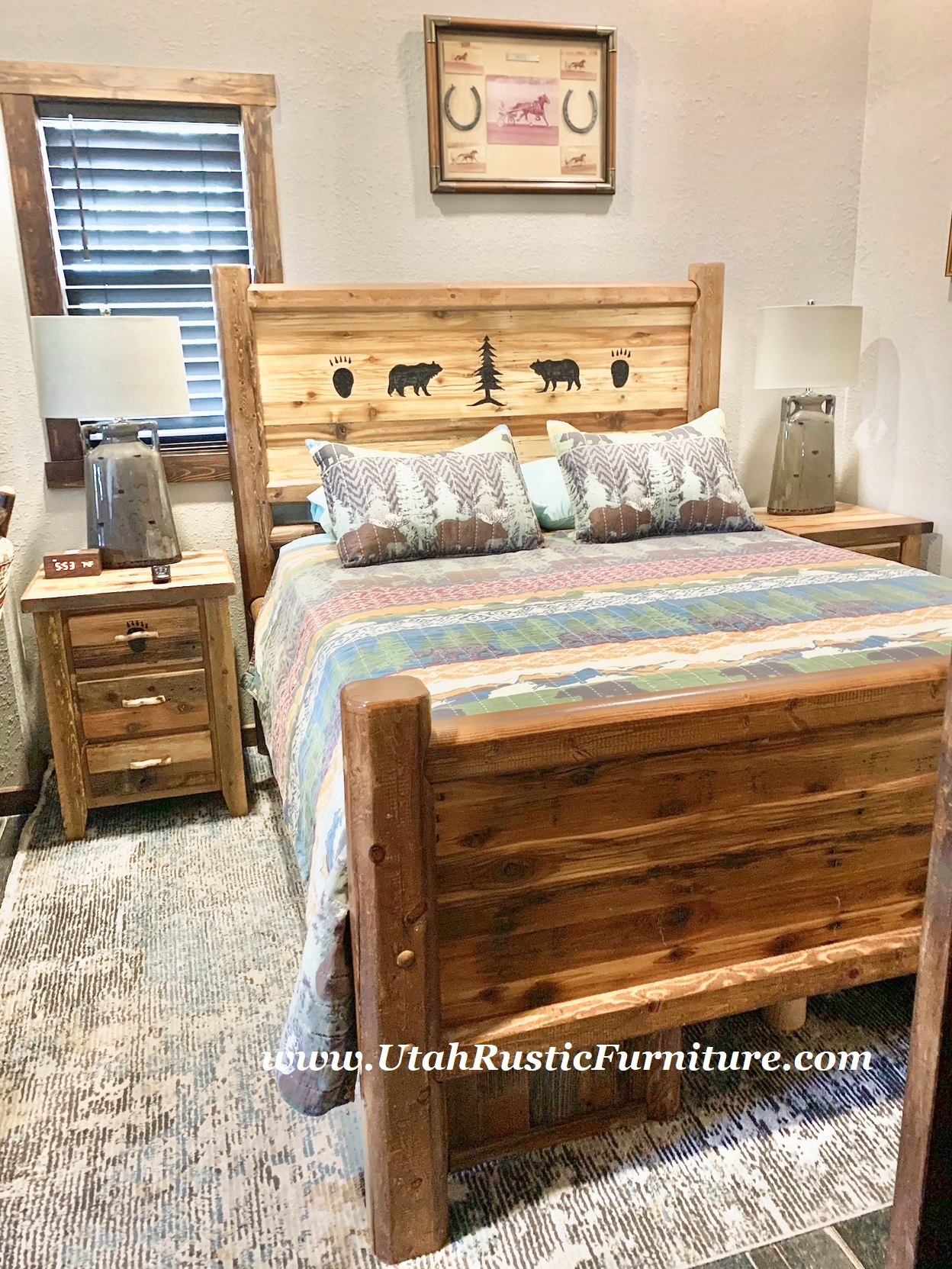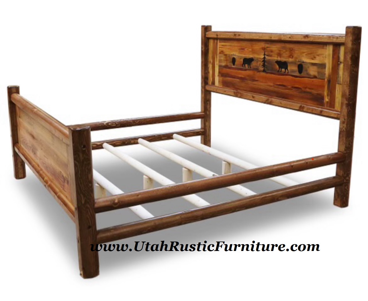 The Bear Paw Creek Collection is designed to help bring the outdoors into your own bedroom! The Barnwood used in this collection is reclaimed from fences and barns, can consist of a mix of mahogany, cherry, oak, pine, or alder woods, and is finished to showcase the unique characteristics found only with age. This set is completely customizable and can be ordered in a different stains to accent the natural colors of the Barnwood. Come in to see all of our available finishes and options on our showroom. We feature three different styles for this collection: The Bear Paw, Arched, and Premium Collections. Our Bear Paw and Arched collections feature barnwood panels and solid lodgepole pine posts, while the Premium Barnwood Collection features solid barnwood on the panels and posts.