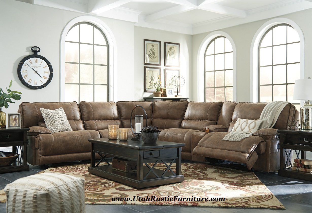 The Thurles 558 Walnut Brown Distressed Microfiber Sectional by Benchcraft Signature Design, looks