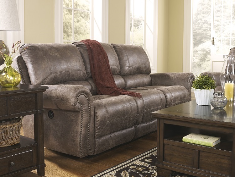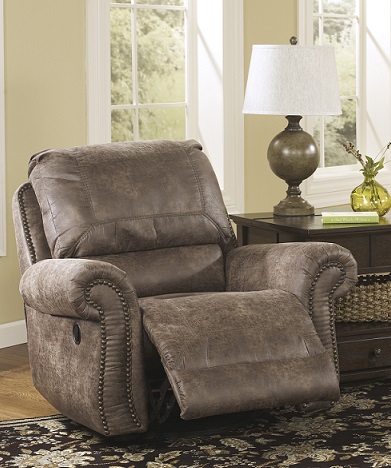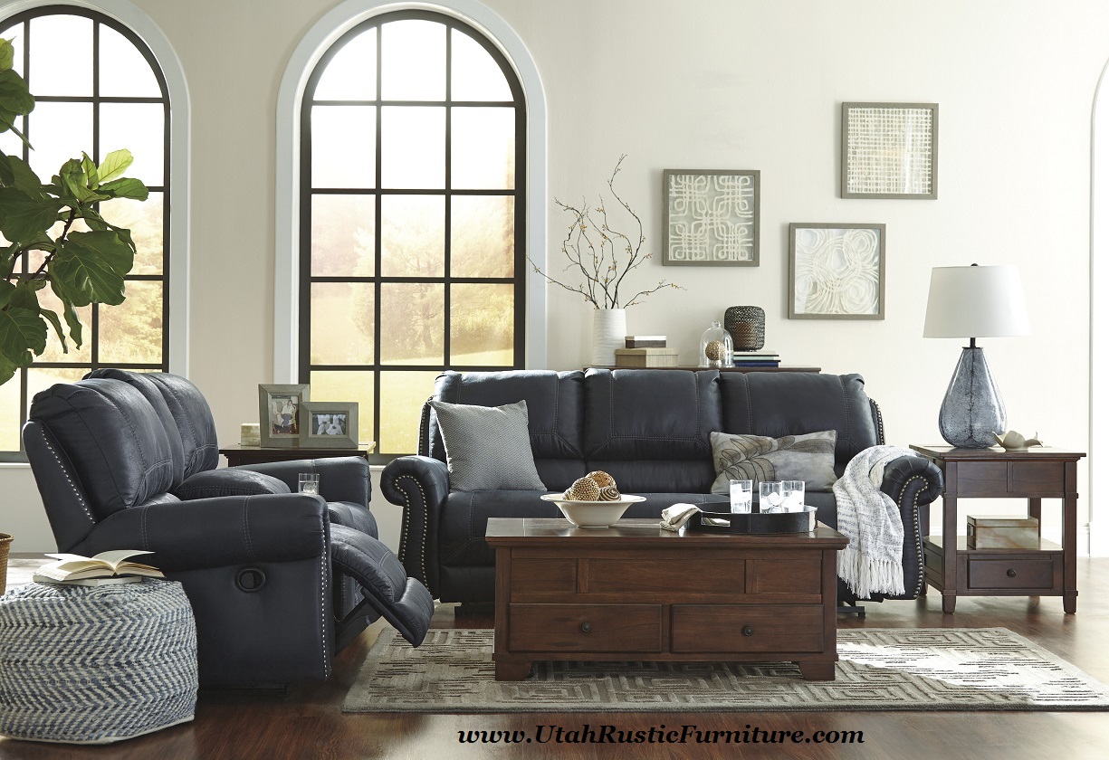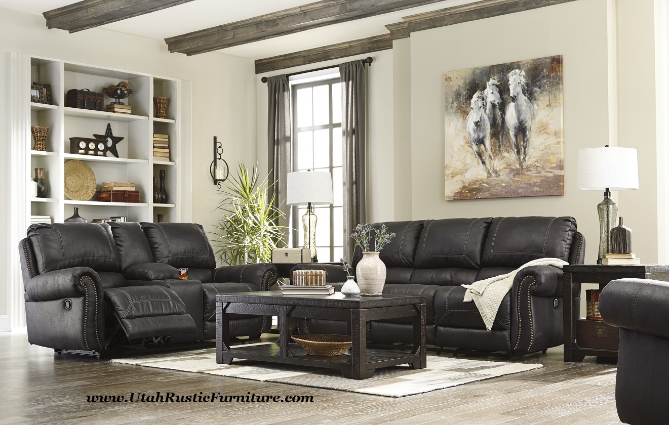 The #741 Oberson Earth Gunsmoke and #633 Milhaven (03 Black and 04 Navy) Collection by Benchcraft offers a cutting edge Distressed Microfiber designed to look like leather and providing easy clean-up against everyday family spills and stains! With an elegant flowing design featuring rich upholstery and exquisite detailing, the Oberson and Milhaven upholstery collection captures the true beauty of grand traditional styled/rustic furniture. The steel reclining frames feature a limited lifetime warranty. This set is available in a standard or power reclining option!