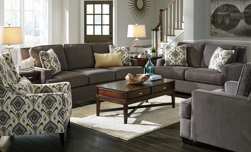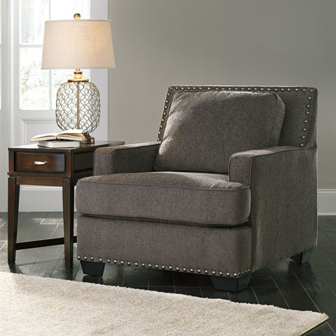 With the stylish look and feel of the textured gray chenille upholstery fabric beautifully surrounding the sleek track arms and plush back and seat cushions, the “Barinteen-Granite” upholstery collection offers the comfort you deserve without sacrificing that special look that enhances your living room décor. The sophisticated look of nail head accents is sure to add that finishing touch to truly dress up any home.