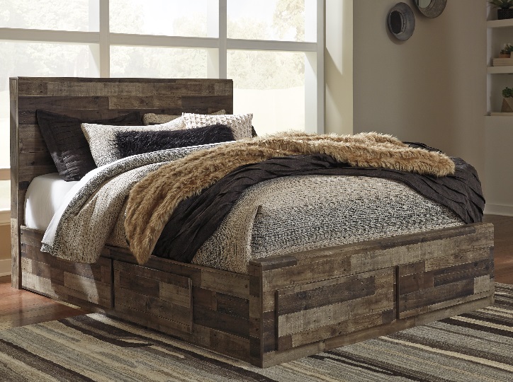 The Derekson Collection features a rustic butcher block finish over replicated pine grain with an authentic touch. The Nightstands and Dresser Units feature a framed front and pilasters and each bed features a thick and heavy design. Contemporary handles in an antiqued gunmetal finish round out the mountain modern design. The drawers are a side roller glide system with each drawer interior finished with a replicated linen design. Slim USB chargers are located on the back of the nightstand tops. We show the bed and Nightstand on our showroom but other pieces are usually avail. within 2 or 3 weeks.