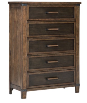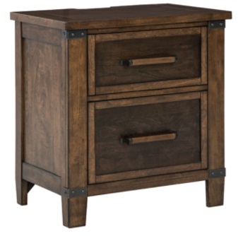 Casual two tone styling. Made with solid wood and Mango veneer. Finished with a walnut brown coloration accented with a dark burnt umber bed panels and drawer fronts. Panel bed with cross buck details with two overhead sconces for reading or ambient light. Well proportioned cases feature fully finished drawer boxes with dovetail construction and ball bearing side glides. Custom designed wooden bar pulls with metal keepers. Night stand includes a 110V power supply with dual USB charging ports. Upper drawers have black felt bottoms.