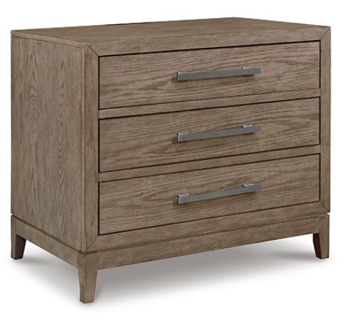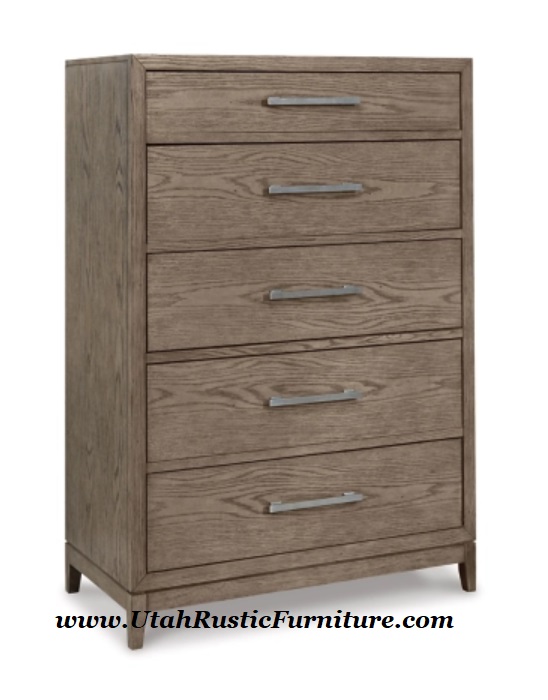 Made with hardwood solids, select oak veneer and engineered wood substrate. A blend of stains and glaze create a richly executed waxy gray finish. Fully finished drawer boxes with dovetail construction and soft-close ball bearing side glides. Upper drawers come with black felt drawer bottoms. Large custom designed metal bar pulls are finished in a light pewter coloration. The upholstered bed has solid wood frames surrounding cushioned panels covered with a luxuriously soft fabric with a lamb's wool-like look and feel. Nightstand includes a 100V power supply and dual USB charging ports.