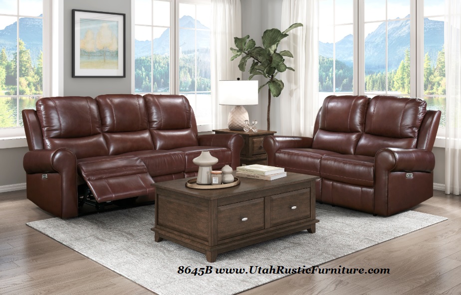 The 8645 Power Head Rest and Reclining Leather Set by Homelegance, offers 100% Top Grain Leather on all of the arms and seat areas and Protected Faux Leather PVC everywhere else. This rustic/traditional design features rolled arms, divided bustle back cushioning and waterfall chaise pad seating