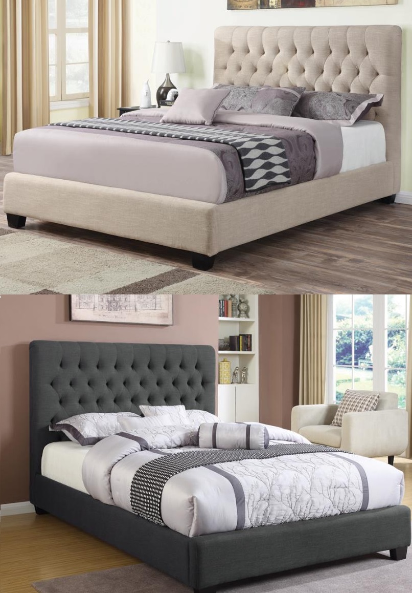 Features a rolled Headboard with Diamond Button Tufting, Individual Nailhead Trim, and Turned Legs finished in cappuccino. Avail. in Grey (Full Only) and Linen Colors.