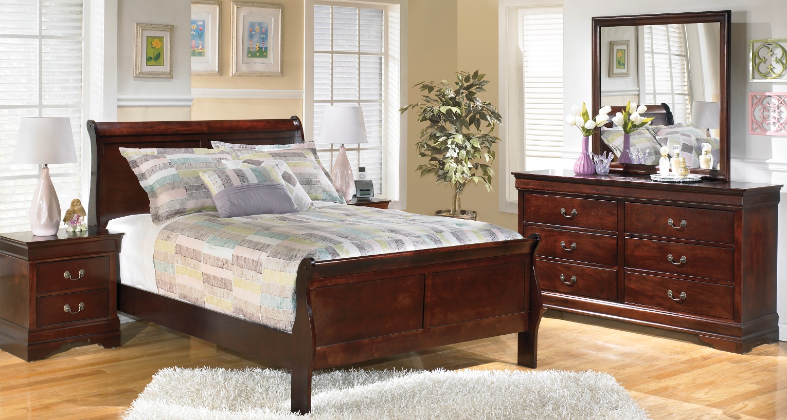Traditional in design and modest in scale, the elegant Mayville Collection takes its design inspiration from classic Louis Phillipe styling. Featuring a burnished brown cherry finish and all of the traditional flare unique to the style – antiqued metal bale hardware and distinct framing- this collection is a perfect addition to your traditional bedroom, especially if you don't have a large space to work with!