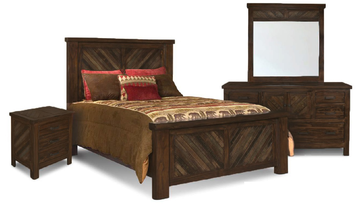 The Remington Set features solid wood framing and is constructed in North America. The nightstand features full extension ball bearing drawer glides and matches the accents on the top and side panels of the headboard and footboard with green, white, and brown herringbone slats. On display today!