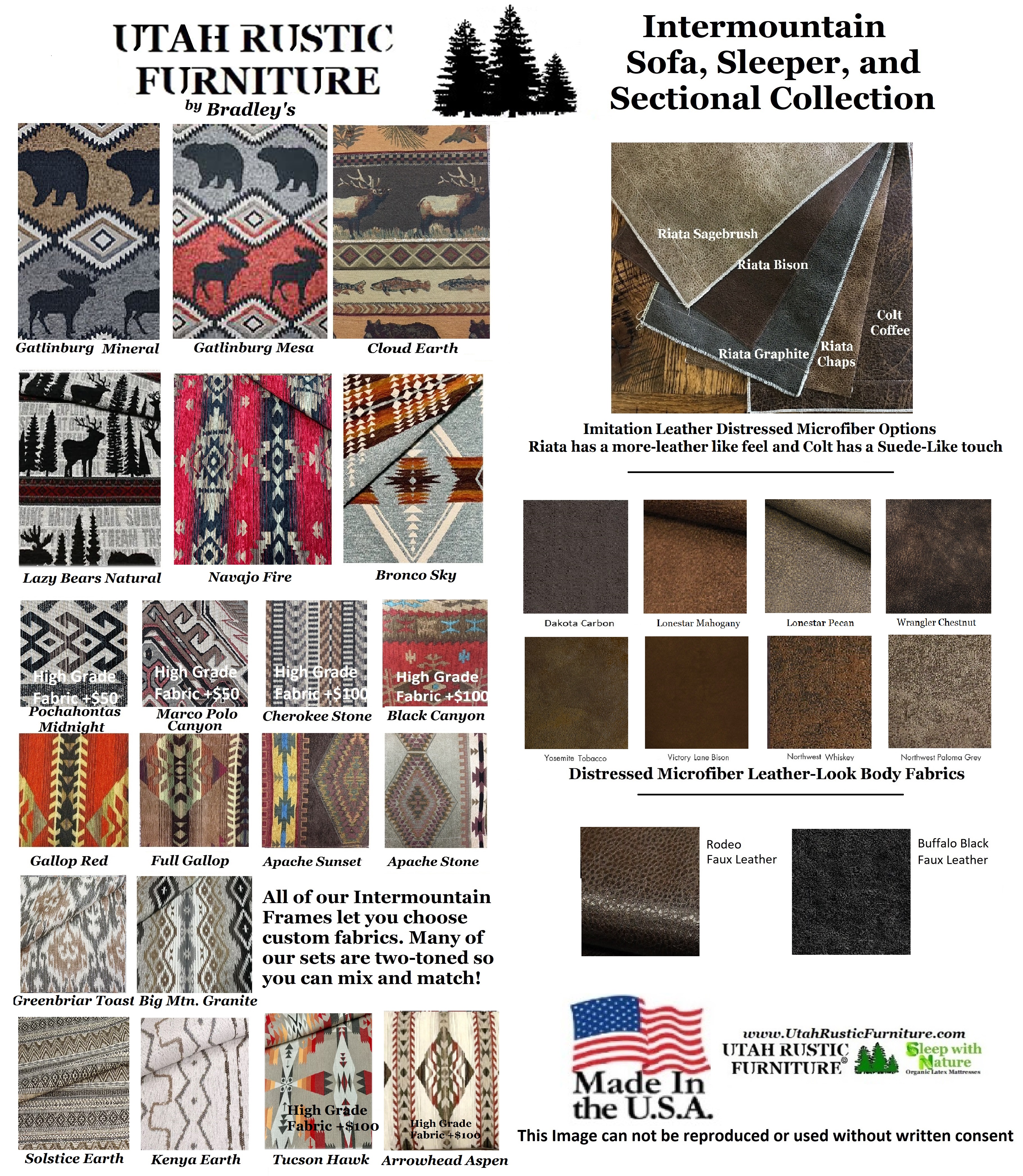 Bradley's Furniture and Intermountain were each founded here in Salt Lake City and have worked together for more than 30 years providing customizable rustic fabric and leather sets with a focus on premier quality. The collections seen are customizable with hundreds of different fabric combinations. Visit Bradley's Furniture to see the wide variety of options! | |||