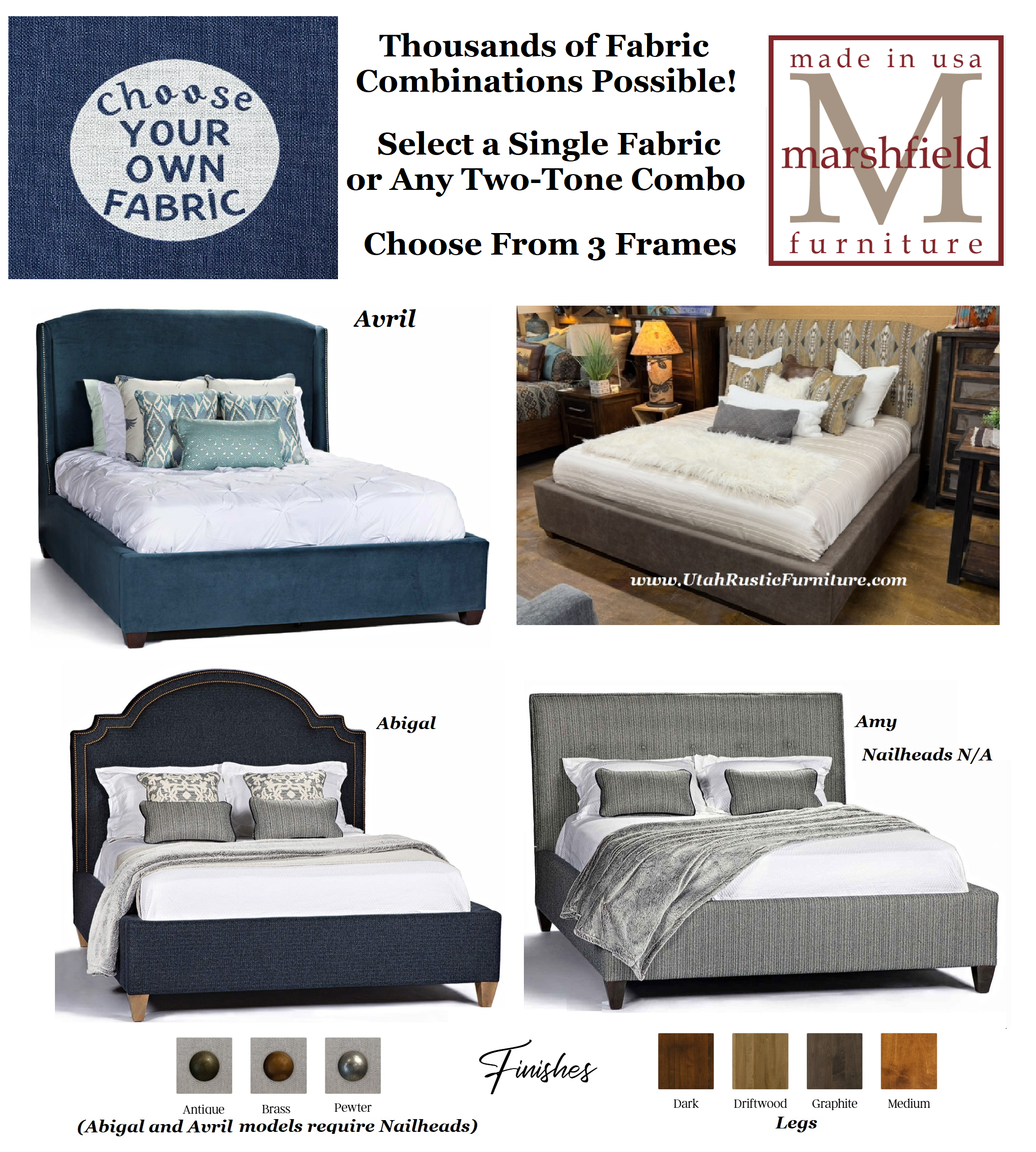 The Marshfield Bed collection features three different styles of beds and over 1000 fabric combinations to choose from! Marshfield specializes in rustic animal or aztec prints along with 100s of Premium Revolution, Crypton, or Sustain Performance Fabrics. You can either two tone the bed as shown above or choose a single body fabric to be used all over. Choose from Brass, Antique, or Pewter Nailheads (the Avril Frame shown above and Abigal frame shown bottom left require nailheads and the Amy frame bottom right cannot have nailheads) and Medium Golden, Graphite Grey, Dark Walnut, or Driftwood Light stained wood legs. Allow approximately 6 weeks to make plus another week or so to ship.