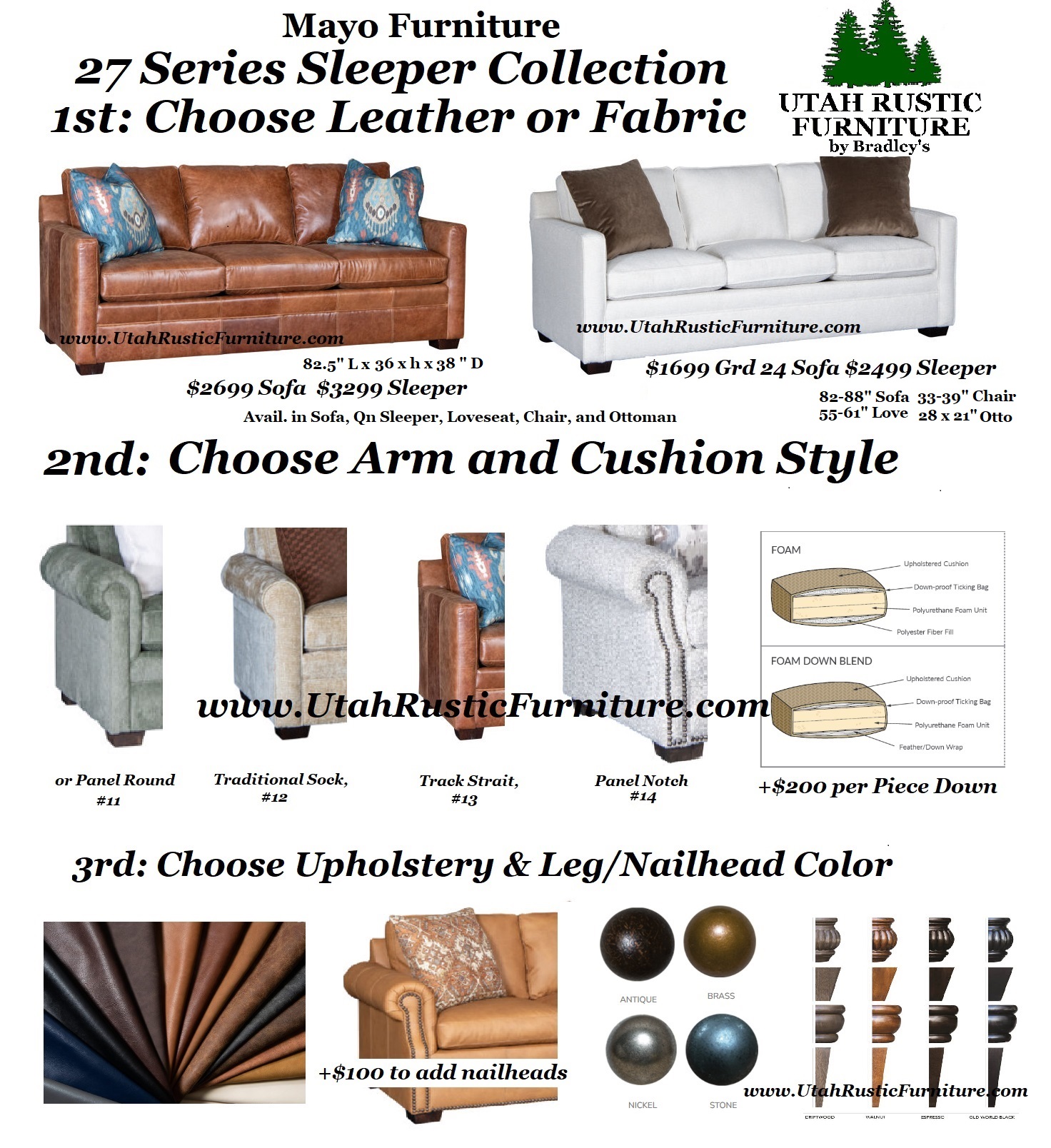 First, choose from a number of popular frames (below are our best sellers) or visit Mayo's website for all current options and fabric/leather samples; www.mayofurniture.com. Then, choose