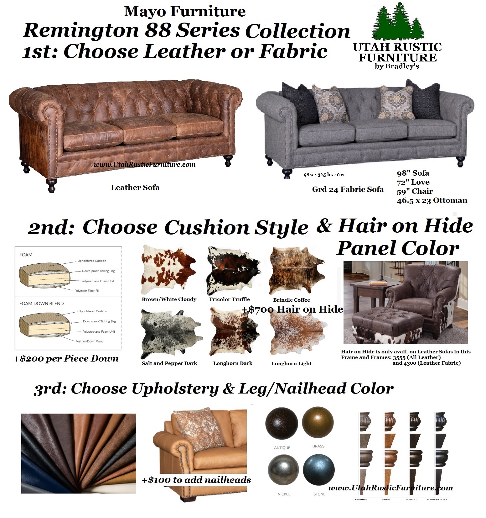 all-leather, leather-fabric combo, or all-fabric material options. See below to select from a number of rustic or traditional fabrics and