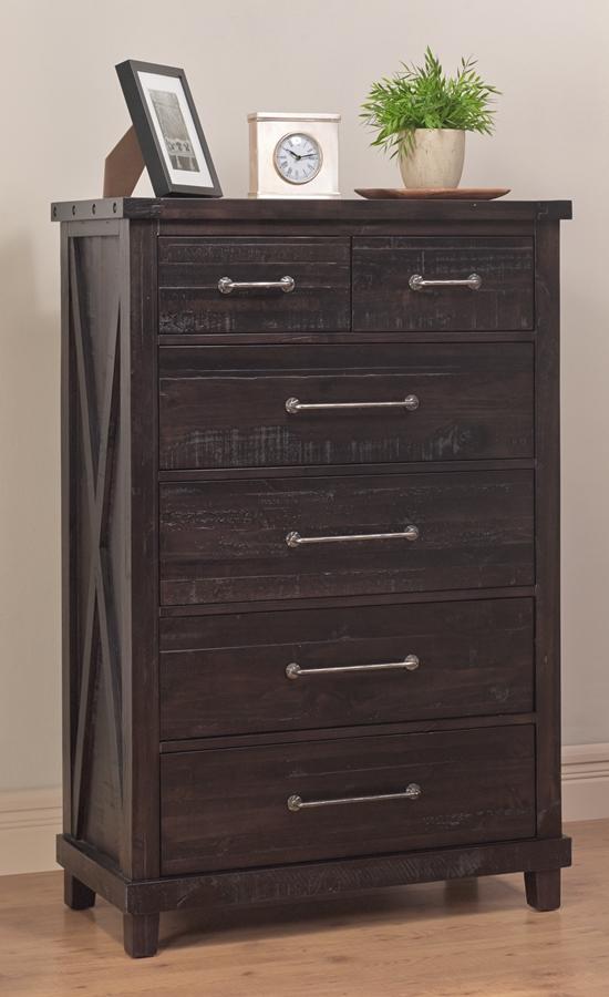 The Yosemite collection is made from 100% solid wood distressed to emulate reclaimed barnwood. A rich dark chocolate stain with hand forged iron accents and drawer handles combine for a timeless rustic style. The Nightstands, Chest of Drawers, & Dressers feature full extension drawer glides and solid wood construction. Drawer interiors are sanded and stained and the top drawers are felt lined. Barndoor Wood Headboard or Fabric Headboard styles are available and are the same price! Cal King or King Bed Queen Bed Full Bed | ||