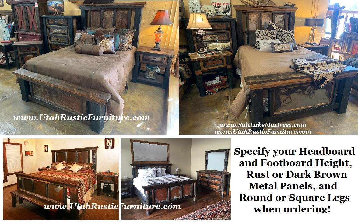 Allow 6-8 weeks for shipping. Standard finishes are Round Post Legs with Wired Early American Stained and Wired Spruce Caps, Authentic High-Sand Early American Stained Barnwood Tops and Sides on Dressers, Chests, and Nightstands, and Dark Walnut or Two-Toned Black Trims around Panels and Drawer Faces. Specify Square Posts at the time of Purchase if desired.