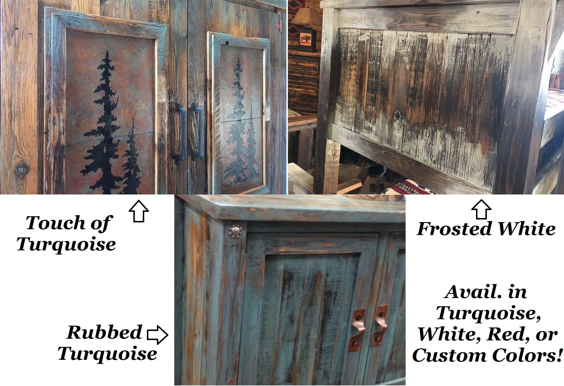 - Custom Sizes Available. Shown Top Medium Stain Smooth/Med Multicolor w/Leather Handles (Top Right w/Metal Accent Drw), Bottom Left Dark Stain Smooth/High Sand Dark w/Custom 8" Rod Handles and Antler Branches, Bottom Right Touch of Turquoise Smooth (+15%)