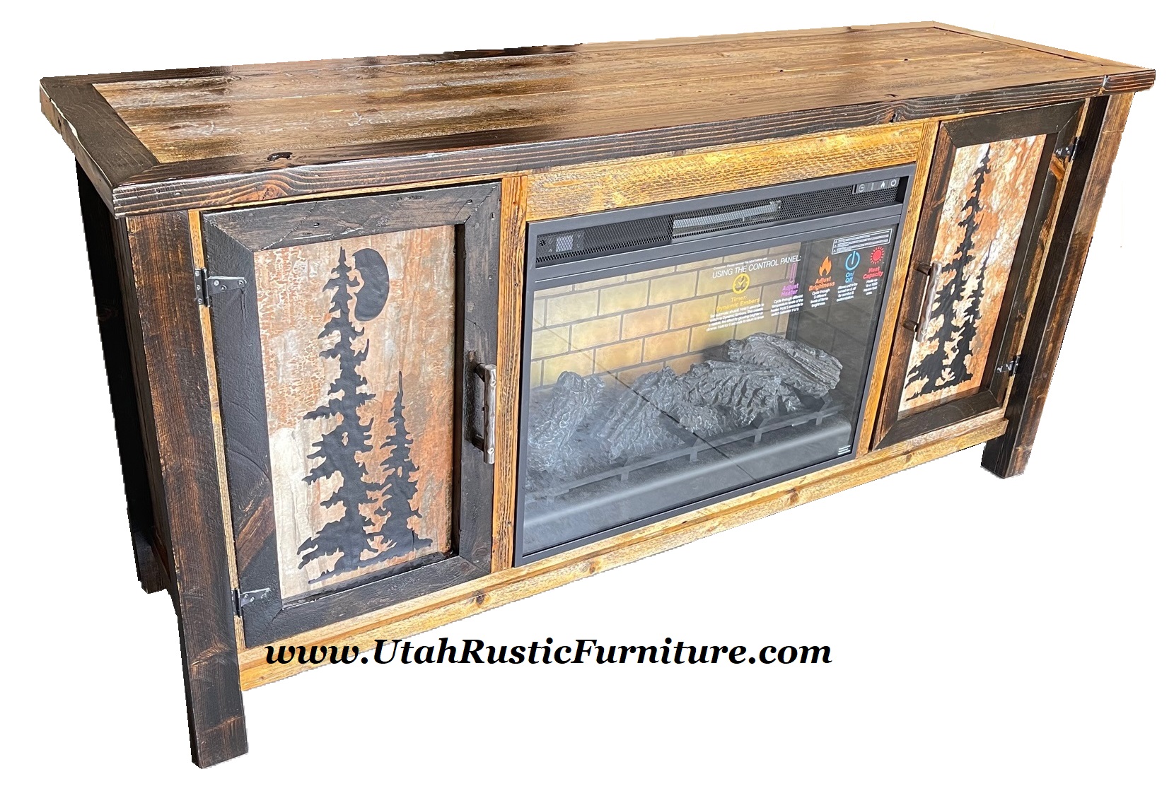 Custom Handmade Rustic Fireplace Units ![]() Custom Western Plains Fireplace Unit $3499 Customizable Dimensions 68w x 18d x 48"H- Includes an Infrared Fireplace and Remote Included- #W100-12 43"w x 17"h $599 Heats up to 1000 Sq Ft w/Temperature Control and 5 Heat Settings, 5 Flame Level Settings& Bluetooth Speakers! -Warms up to 1000 sqft. - Also available in a non-infrared 400sq ft unit 24x20 with pebbles and/or plastic gems and color lights for the same price) Custom Western Plains Fireplace Unit $1599 Customizable Dimensions 65w x 16d x 38.5"H- Includes an Infrared Fireplace and Remote Included #W100-101 24" x 20"h or #W100-121 31"w x 24"h ($100 more) w/Temperature Control and 5 Heat Settings, 5 Flame Level Settings& 3 Light Levels! -Warms up to 1000 sqft. - Also available in a non-infrared 400sq ft unit 24x20 with pebbles and/or plastic gems and color lights for the same price) Custom Western Plains Two Tone Dark Trim, 2 Door Fireplace Unit $1749 Customizable Dimensions- As Shown 72w x 21d x 35"H Includes an Infrared Fireplace and Remote Included #W100-101 24" x 20"h or #W100-121 31"w x 24"h ($100 more) w/Temperature Control and 5 Heat Settings, 5 Flame Level Settings& 3 Light Levels! -Warms up to 1000 sqft. - Also available in a non-infrared 400sq ft unit 24x20 with pebbles and/or plastic gems and color lights for the same price) Custom Western Plains 2 Slider Door, 2 Drw, 2 Large Door Wide Fireplace Unit $2099 Customizable Dimensions 92"w x 18" d x 40" h #W100-22 Wide Infrared Fireplace (Shown) and Remote Included w/Temperature Control and 5 Heat Settings, 5 Flame Level Settings, 3 Light Levels, and a Sleep Timer! -Warms up to 1000sqft. Custom Western Plains 2 Door, 2 Drw Fireplace Unit $1999 with added fireplace (not shown) Customizable Dimensions 65w x 16d x 38.5"H #W100-22 Wide Infrared Fireplace (Shown) and Remote Included w/Temperature Control and 5 Heat Settings, 5 Flame Level Settings, 3 Light Levels, and a Sleep Timer! -Warms up to 1000sqft. - As Shown $2399 if we add a fireplace ![]() Shown with optional Touch of Turquoise Custom Aspen Fireplace w/Cabinets $2949Customizable Dimensions 65w x 16d x 38.5"H #W100-21 Upgraded Infrared Fireplace (Shown) and Remote Included w/Temperature Control and 5 Heat Settings, 5 Flame Level Settings, 3 Light Levels, and a Sleep Timer! -Warms up to 1000sqft Also avail. with a W100-01 basic fireplace unit for $100 less -Warms up to 400sqft ![]() Custom Barnwood Fireplace w/Shelves $1299 (Customer provided their own fireplace. Add a basic unit for $200 or the infrared unit for $300) ![]() Infrared Fireplace and Remote Included - On Display Today! #W100-101 24" x 20"h $379 #W100-121 31"w x 24"h $399 Heats up to 1000 Sq Ft - On Display Today!