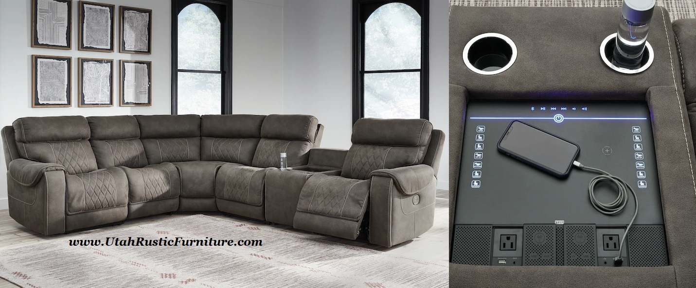 #237 Luxury Gunmetal Color Distressed Microfiber Sectional - Includes 2 Power End Recliners, one Middle Recliner, and Luxury Control Center w/Audio and Presets
