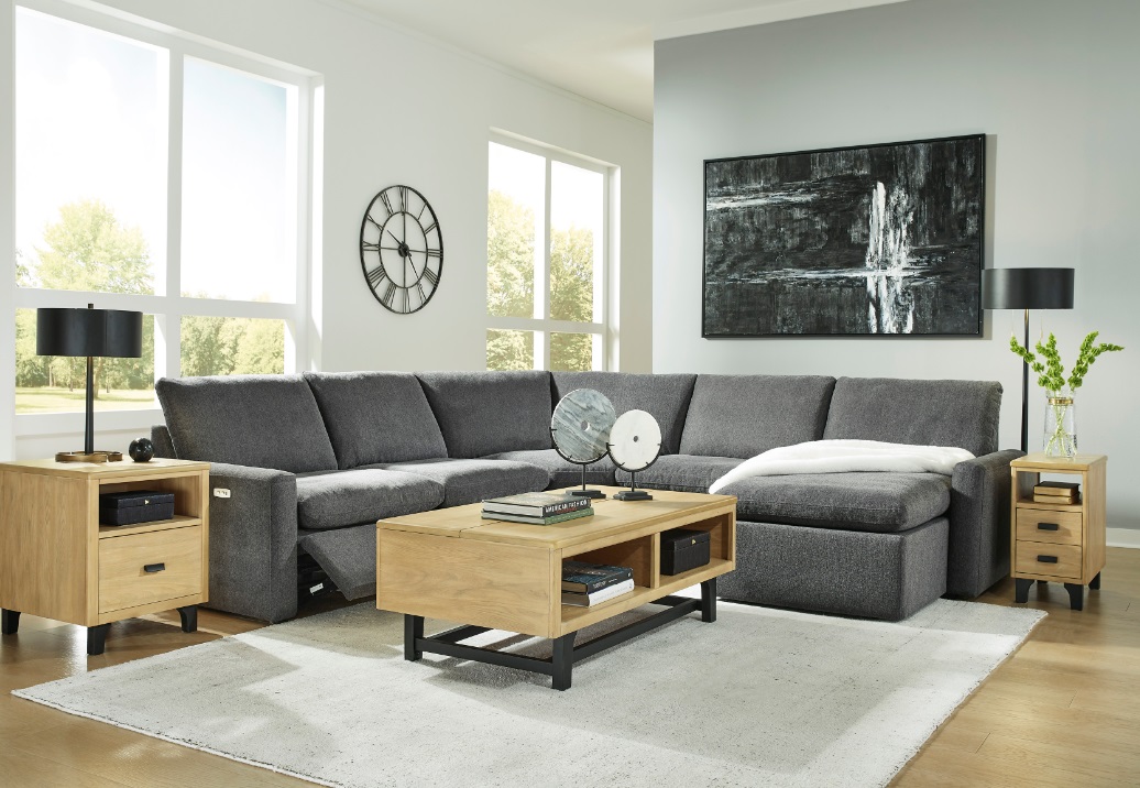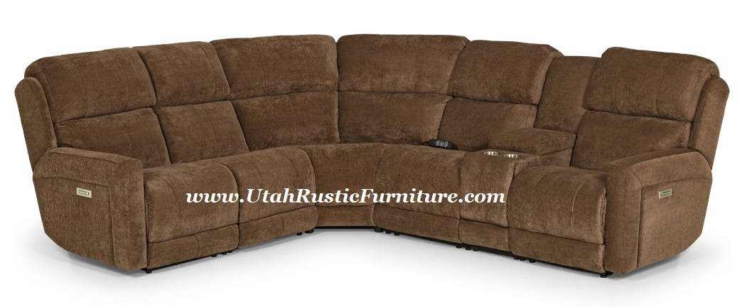 #843 As Shown 119" x 106" Reversible 6 Piece w/2 Power Recliners Price: $6399 $5399 - Shown in Deschutes Ink
