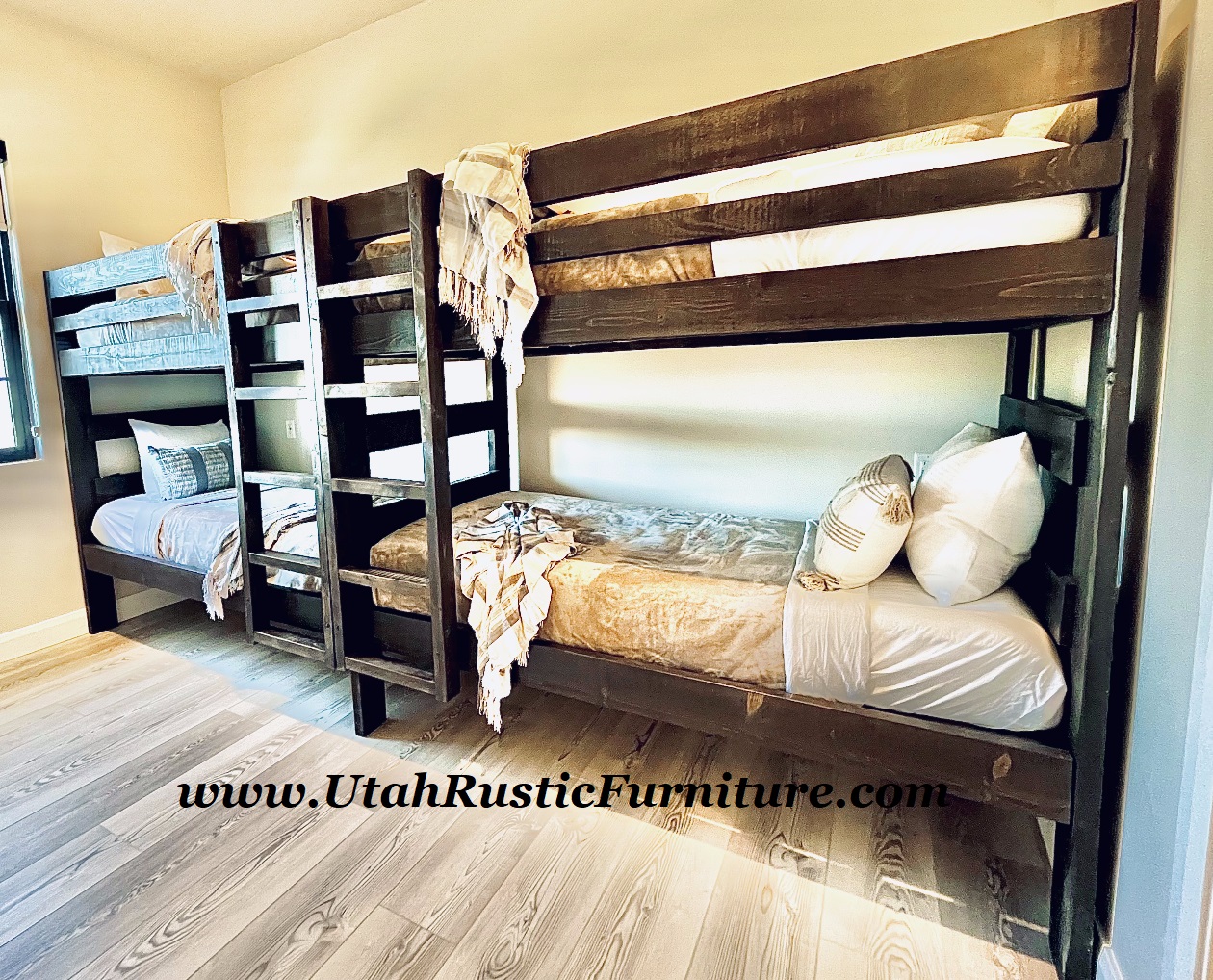 The SNW Solid Spruce Bunkbed Collection is made locally in Salt Lake City 100% by hand. Each piece showcases the attention to detail put in every piece of furniture. This collection is available in any combination of Twin, Full, and Queen sizes and is customizable to any dimension! Choose from 6 different stain colors (Clear, Light, Dark, Umber Cherry, or Sherwin Williams Grey Stain +$100) and 4 Paints (+$100 for all - Urban Bronze Dark Grey Paint, Black, Solid White, or Blue), two finish options (rough-cut chunky or smooth sanded +$50), and standard or hand distressed (+50).