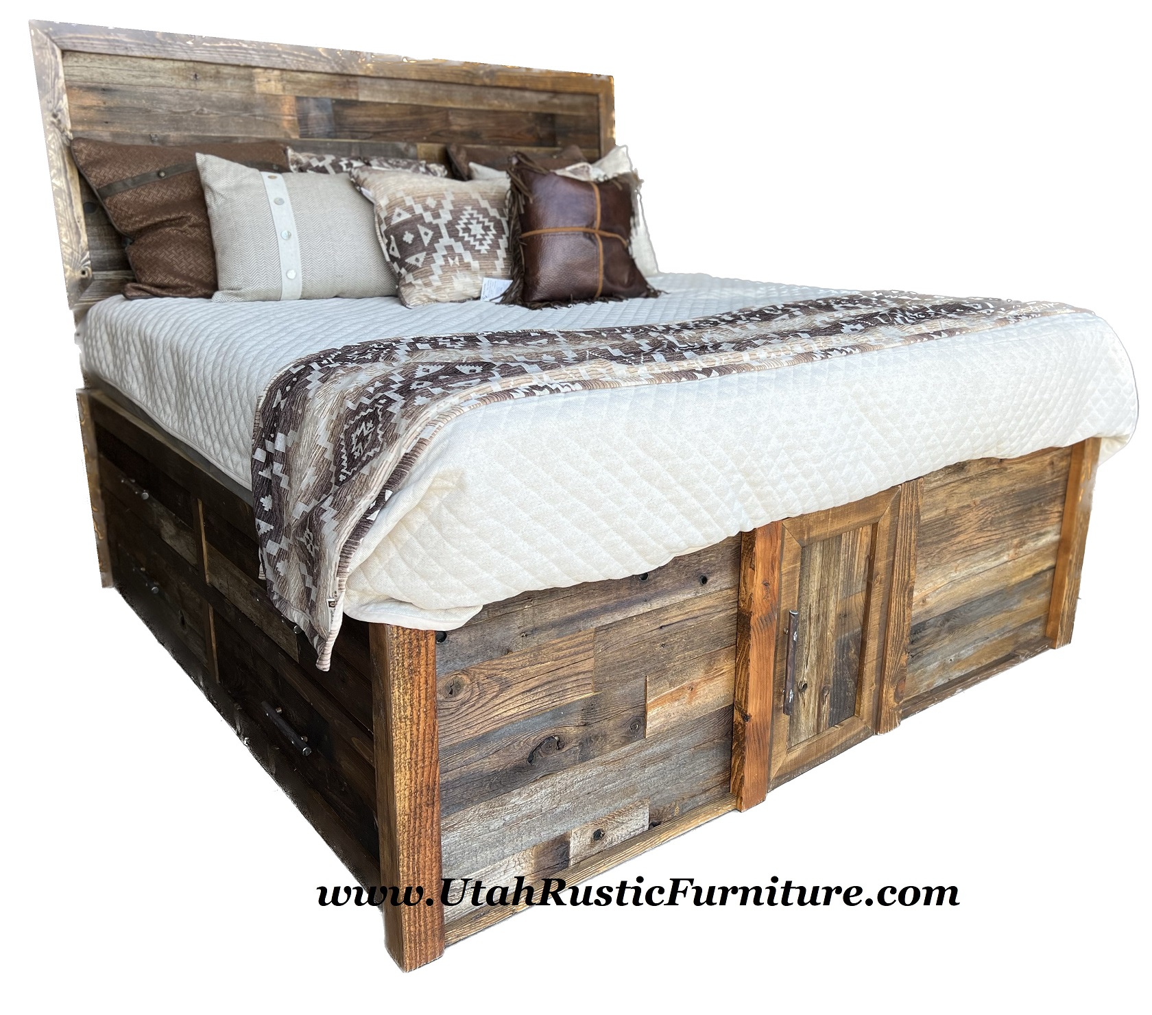The Western Plains Timbercreek collection is made from sturdy reclaimed barnwood. Hand picked barnwood panels accent solid wood posts and trimming. Nightstands, Chest of Drawers, & Dressers feature full extension drawer glides and sized to order on request. Built locally, these are some of the most durable pieces of furniture in the industry. This collection is available in many different stains and customizable dimensions! We show our most popular options below, but note that all pieces can have more or less drawers which will adjust the price higher or lower. Allow approximately 4-6 weeks.