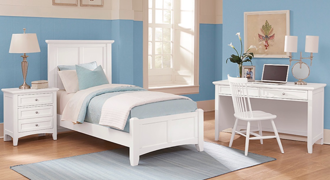Every piece of Chestnut Creek is made from American Maple and Birch Hardwoods and available in three finishes—Fawn Natural, Pewter Grey, and Solid Oak Aged White Apalca w/Greige Tops and Whisper Quiet Drawer Close Finish
