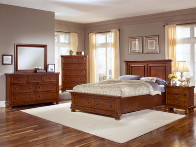Dark Cherry and Medium Cherry, Antiqued Pewter Grey, or Black Ebony stain finish options. With burnished knob pull hardware, solid Hardwood Poplar trimming and support frame construction, functional under bed storage drawer options, and more this set will surely catch your eye. Vaughan Basset sets are milled and constructed right here in the United States by professional craftsmen where they are also focused on the environment and replace every tree used to build each set.