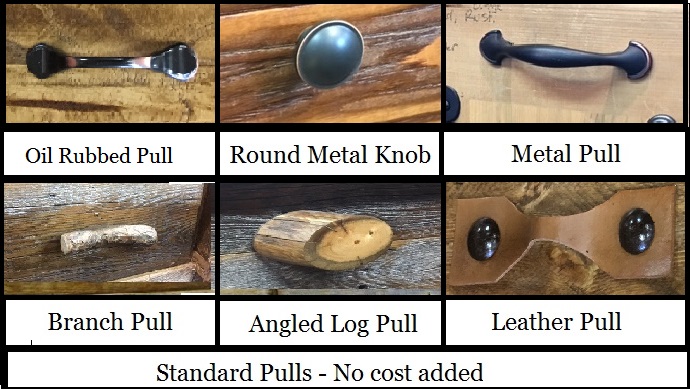 - Custom Sizes Available. Shown Top Left Golden Stain Smooth/Med Multicolor w/Twig Handles, Top Right Dark Stain Rough Sawn/High Sand Dark w/Custom 8" Rod Handles and a Disc. Antler Branch, Shown Bottom Med Smooth/Med Multi Color w/Metal Pull