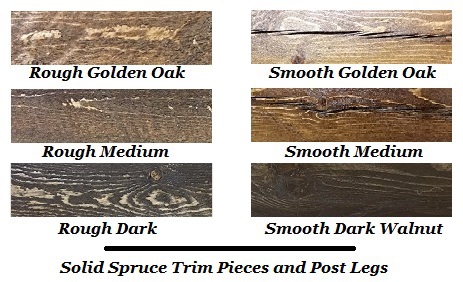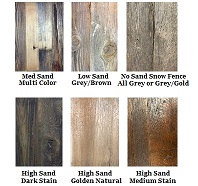 Colors: First choose your stain for the Posts/Trimming between Rough or Smooth Dark Stain, Medium Stain, or Golden Stain. Then choose your finish of Authentic Barnwood Panels out of Medium-Sand Multicolored, Low Sand Grays/Browns, High Stand Dark, Golden Natural, or Medium Options or our Exclusive All Grey or Grey/Gold Snow Fence Wood (10% Upcharge). Last if you want to add a color upgrade to your finish select from a Touch, Frosted, or Rubbed option in Turquoise, White, Red or other paint color for 15% more.