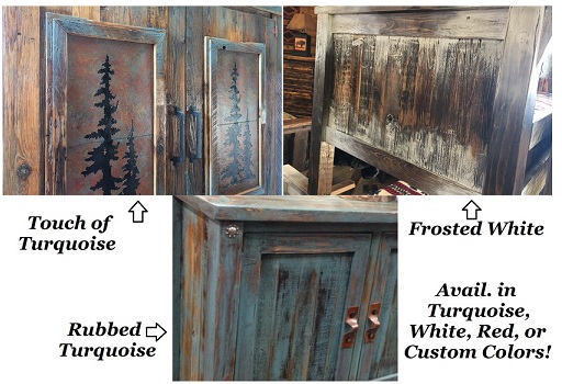 - Custom Sizes Available. Shown Top Medium Stain Smooth/Med Multicolor w/Leather Handles (Top Right w/Metal Accent Drw), Bottom Left Dark Stain Smooth/High Sand Dark w/Custom 8" Rod Handles and Antler Branches, Bottom Right Touch of Turquoise Smooth (+15%)